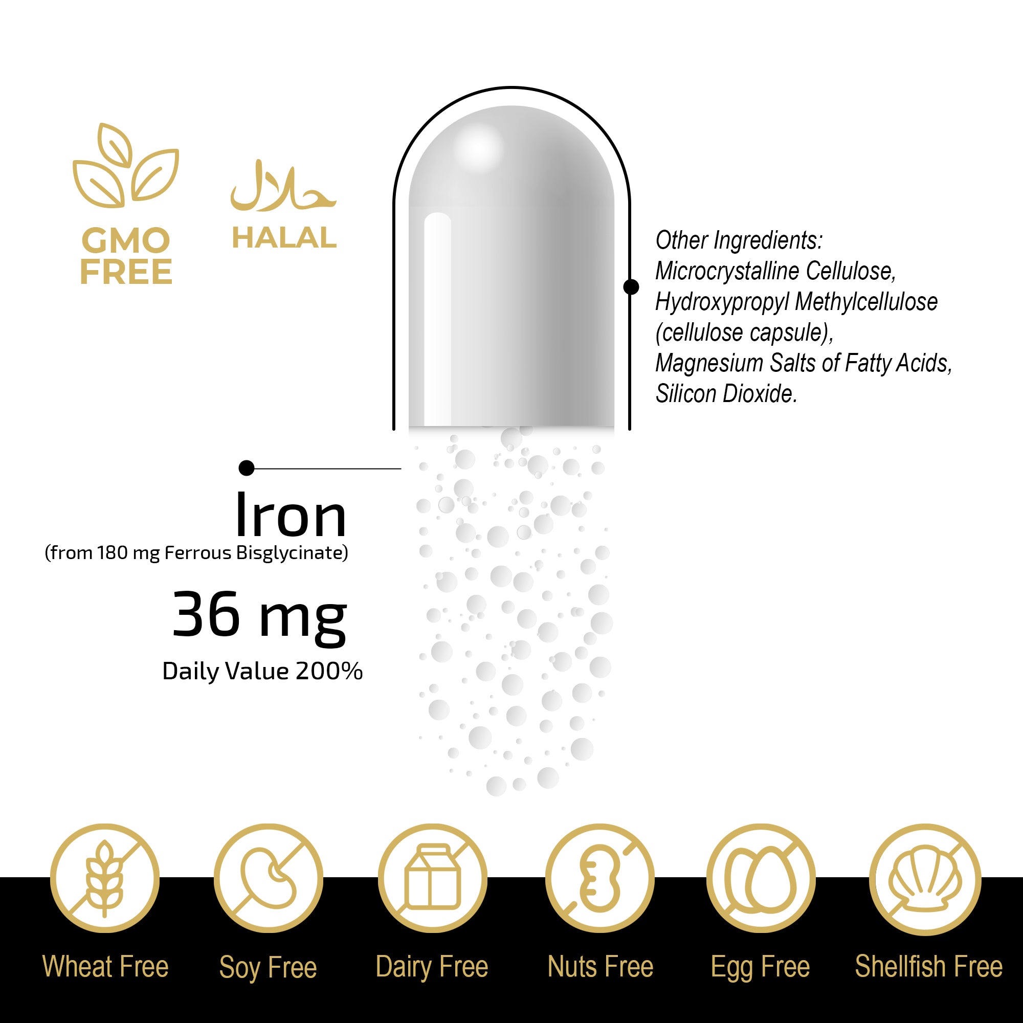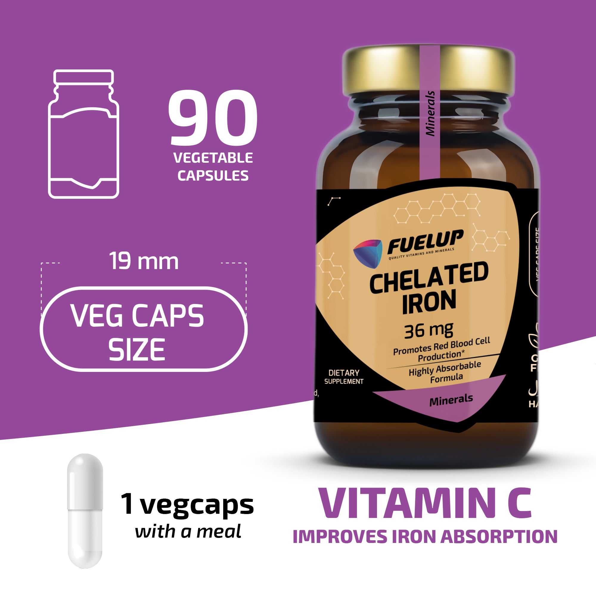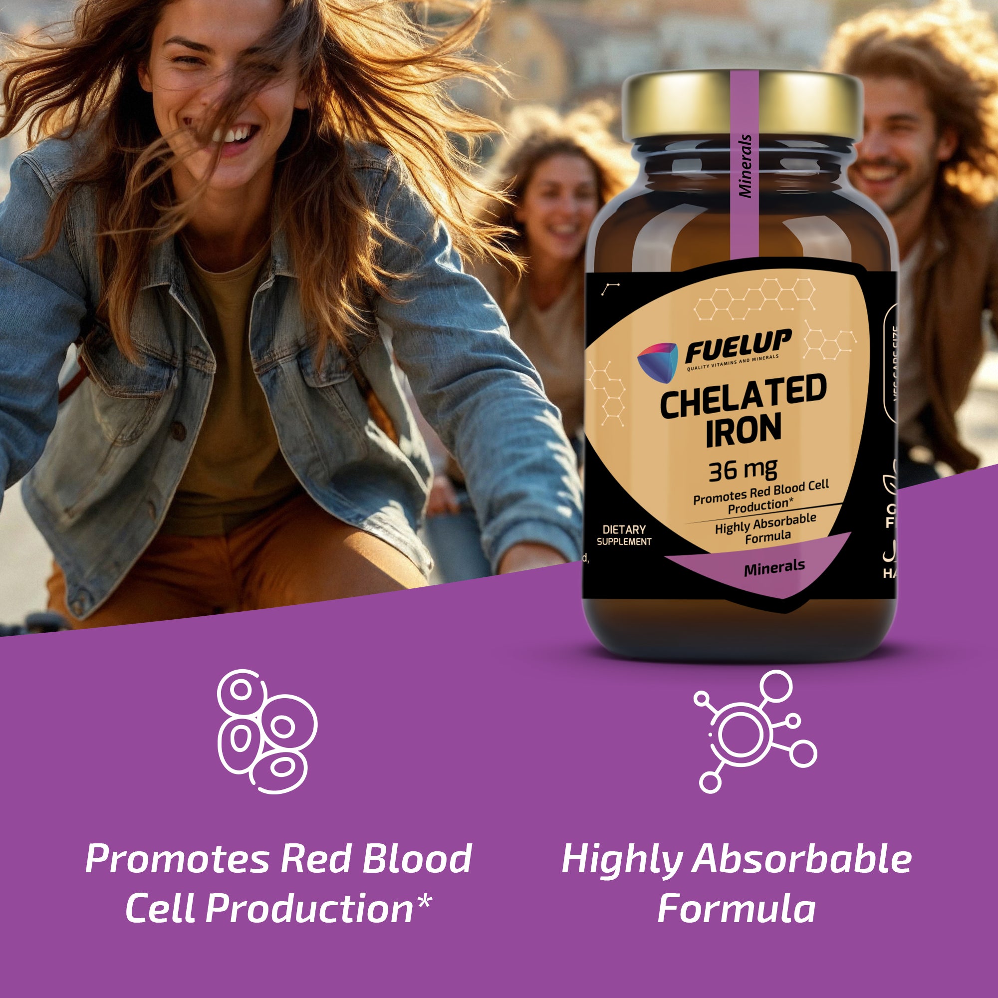 FuelUp Chelated Iron indeholder 36 mg jern i en skånsom og effektiv form (ferro-bisglycinat), der er kendt for høj optagelighed og minimal maveirritation. Det understøtter dannelsen af røde blodlegemer, energiniveau og immunsystemet – perfekt til daglig brug.