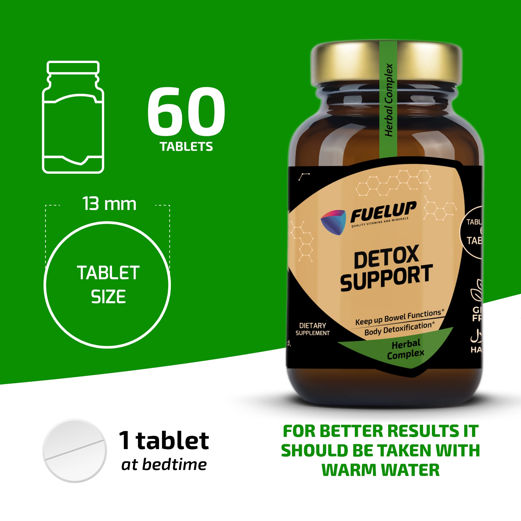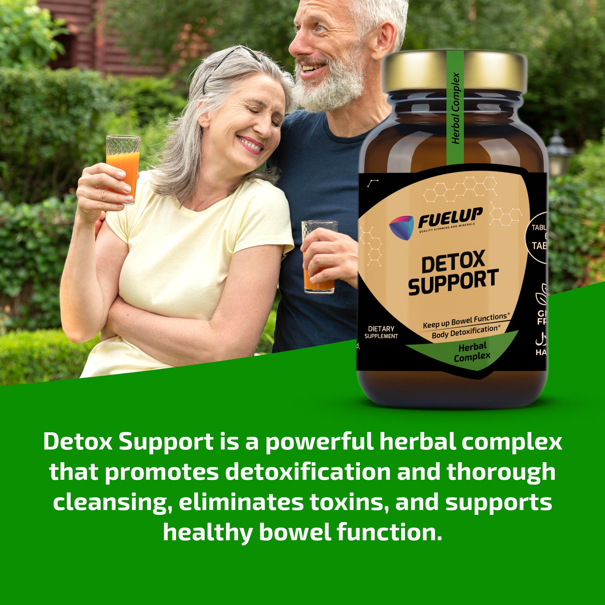 FuelUp Detox Support er en effektiv urtekombination, der understøtter kroppens naturlige udrensningsprocesser og fordøjelse. Den virker som et mildt afføringsmiddel, hjælper med at rense kroppen og fremmer en sund tarmfunktion. Produktet er ideelt til regelmæssig detox og velvære.